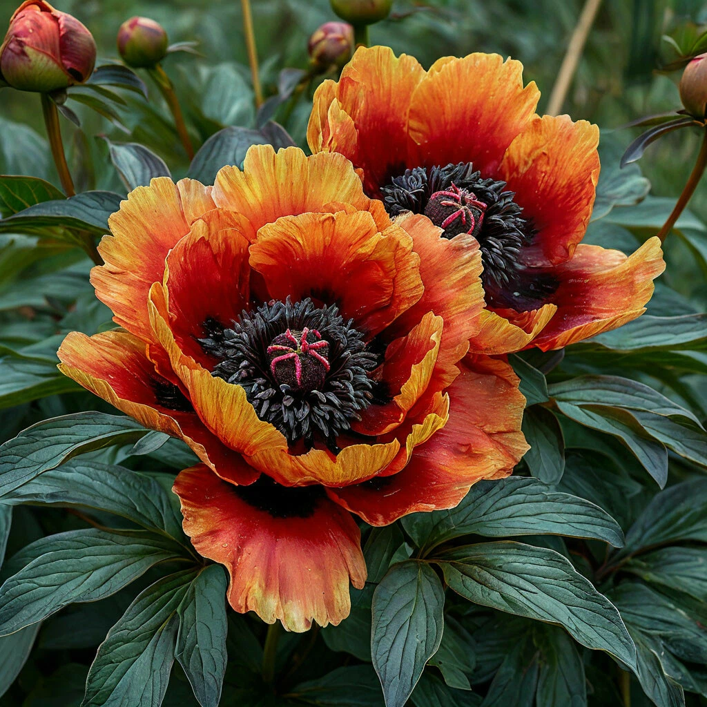 - Цвет: Главная изюминка “Блаш Каскада” – его яркая, насыщенная цветовая гамма. Лепестки имеют живой оранжевый цвет, который варьируется от светлого, почти персикового, до глубокого, близкого к коралловому. Этот яркий фон эффектно оттеняется темной, почти черной сердцевиной цветка, создавая поразительный контраст, который привлекает внимание и делает пион поистине незабываемым.